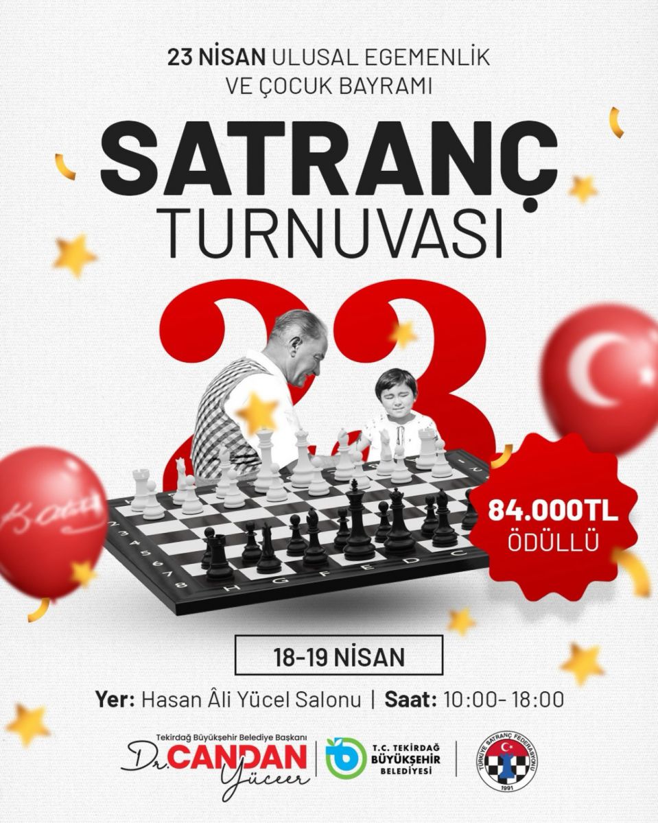 Şölenin zekâ ve strateji ayağını oluşturan Satranç Turnuvası, bayram coşkusunu erkenden başlatıyor. 18-19 Nisan tarihlerinde Büyükşehir Belediyesi Ana Hizmet Binası Hasan Âli Yücel Salonu’nda gerçekleştirilecek turnuvada, 2012-2019 doğumlu lisanslı sporcular dört ayrı kategoride hamle yapacak. 16 Nisan saat 17.00’ye kadar başvuruların devam ettiği bu özel organizasyonda, dereceye giren başarılı sporcular kupa ve madalyanın yanı sıra nakdi ödüllerle de ödüllendirilecek.