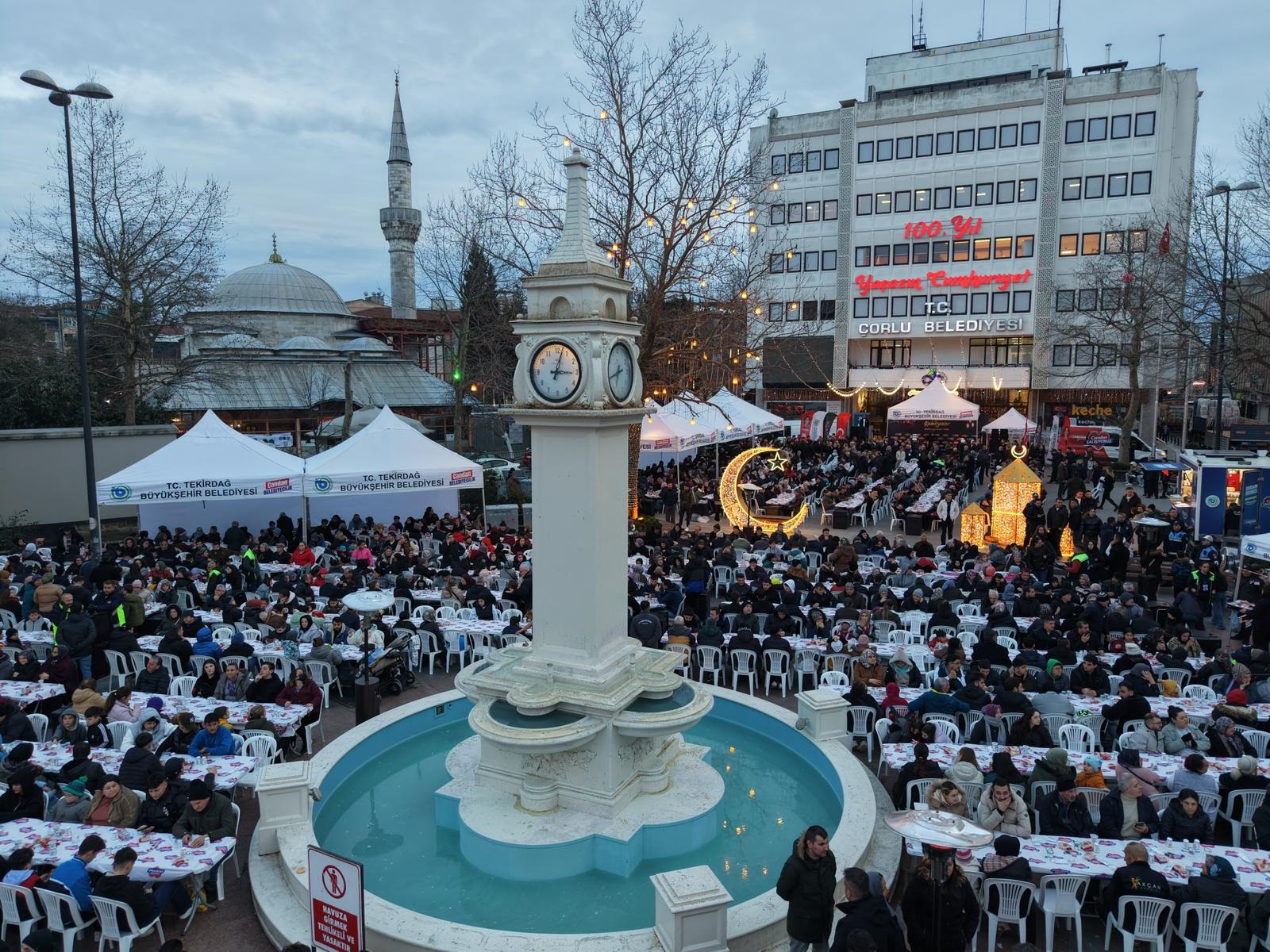 İlçelerde gerçekleştirilen iftar buluşmalarının ikinci adresi Çorlu Cumhuriyet Meydanı oldu. Yoğun katılımla gerçekleşen iftar programında vatandaşlar Ramazan ayının dayanışma ruhu ve birlik beraberlik duygularını hep birlikte yaşadılar.