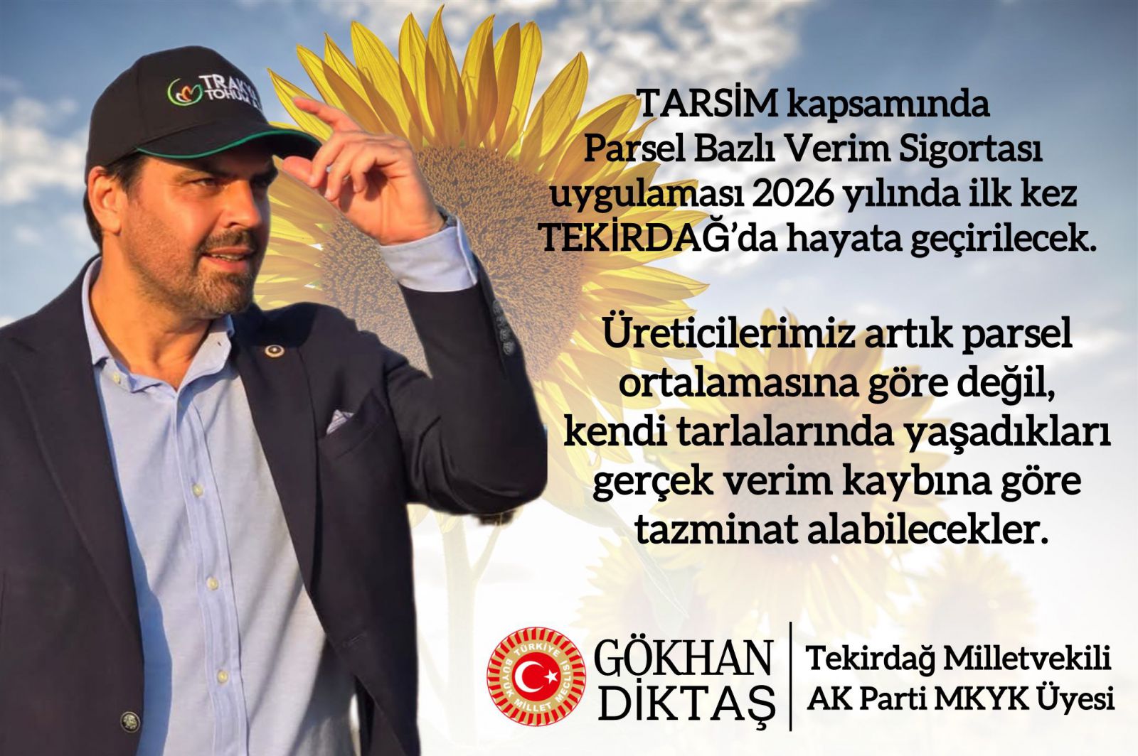 AK Parti Tekirdağ Milletvekili ve MKYK üyesi Gökhan Diktaş, Tarım ve Orman Bakanı İbrahim Yumaklı’nın açıklamalarıyla birlikte, TARSİM kapsamında PARSEL BAZLI VERİM SİGORTASI uygulamasının 2026 yılında ilk kez Tekirdağ’da hayata geçirileceğini belirtti.
